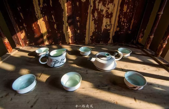 斑駁的木柜,精致的茶具,透過縫隙的陽光,時代感濃郁。