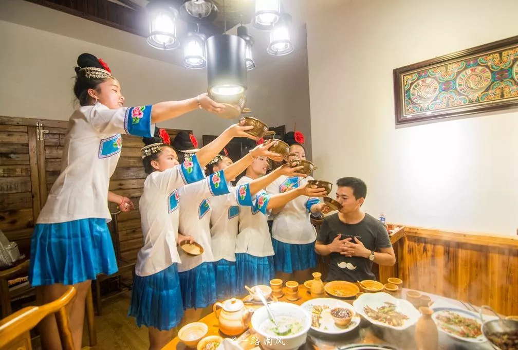 除了包廂的圍餐,飯店的一樓還有長桌宴,樂師更會帶領身著民族服飾的帥哥阿妹向賓客大唱敬酒歌并敬酒,場面氣氛熱烈和諧。