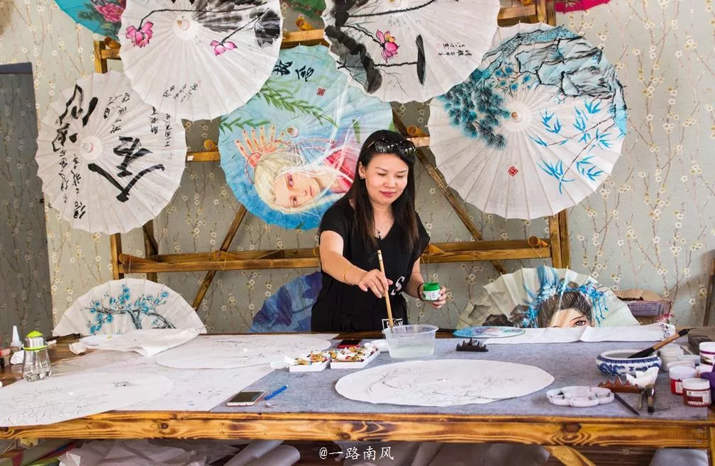 在明記傘鋪,除了欣賞制傘過程,還可以現代體驗畫傘和糊傘。店子里有制作好直接出售的作品,游客也可以根據自己的喜好現場定制。