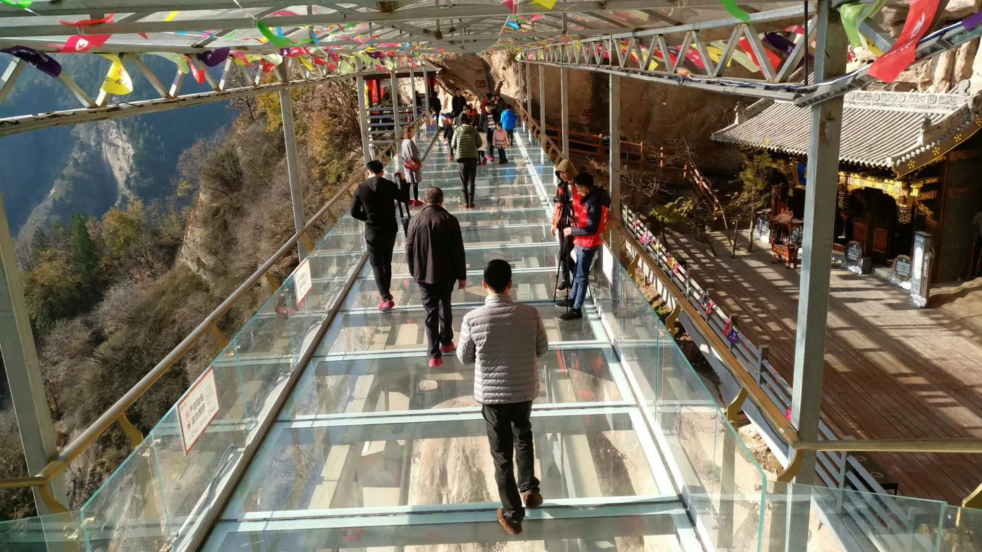 順著山路往上走一段路,就會(huì)看到第一段玻璃棧道,九龍山一共有兩處棧道,這段比較短,我估計(jì)是給游客練膽的,以便到了后面哪段驚險(xiǎn)刺激的長(zhǎng)棧道上不至于嚇得腿軟,旁邊還有一條山路,若是不敢從棧道上面走,可以從旁邊的山路走過(guò)去,但是我建議最好還是在這里適應(yīng)一下,要不然后面有一道更長(zhǎng)的,而且沒(méi)有任何繞行的路徑。