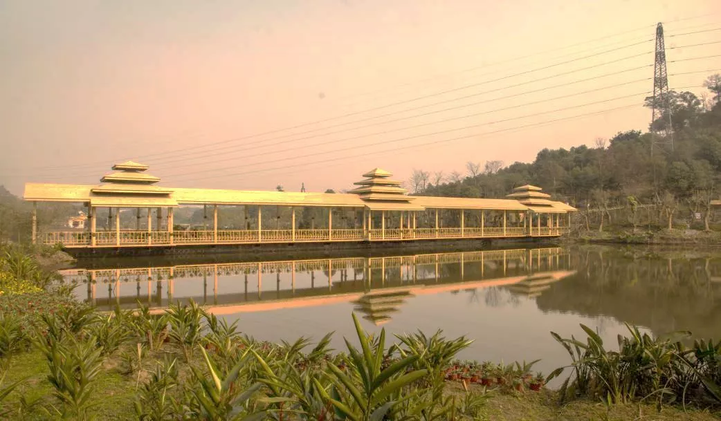 “智者樂(lè)山,仁者樂(lè)水”,而這座佇立在山水之間的親水廊橋不僅將樂(lè)山、樂(lè)水合二為一,又巧妙地將鮮花布置于四周。木結(jié)構(gòu)的廊橋經(jīng)過(guò)能工巧匠精心雕琢,并配有名家揮毫題詩(shī)作畫(huà),充滿(mǎn)了濃郁的藝術(shù)氣息,是一個(gè)非常適合休息娛樂(lè)的場(chǎng)所。