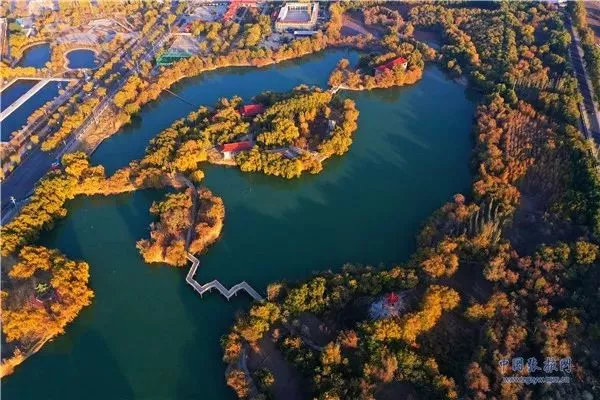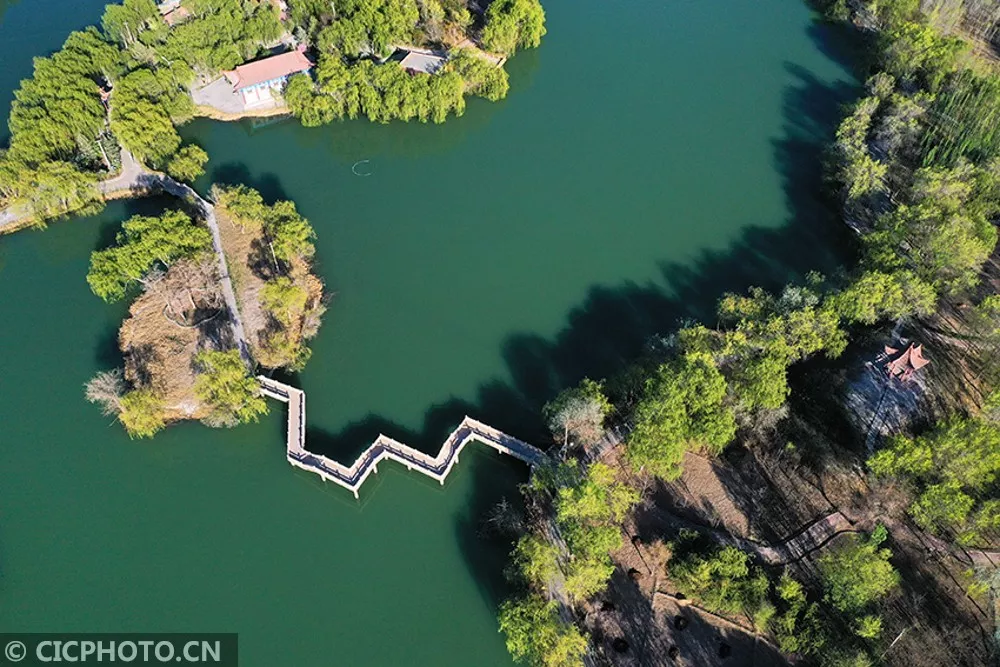 2020年4月25日,甘肅省張掖市高臺縣月牙湖公園,綠柳似簾,湖面如鏡,百米高空下俯瞰宛如鑲嵌在這座西北戈壁小縣城上的“綠寶石”。月牙湖公園占地面積558畝,其中水域面積186畝,湖面有五個島組成,島與島之間曲、拱、平橋相連。園內(nèi)風景秀麗,小橋流水如畫如織,林蔭小道曲徑通幽,素有高臺縣城“后花園”之稱。