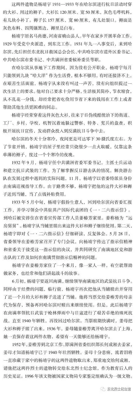 【文物背后的故事】楊靖宇在哈爾濱做地下工作時(shí)穿的大衫和用過(guò)的褥子