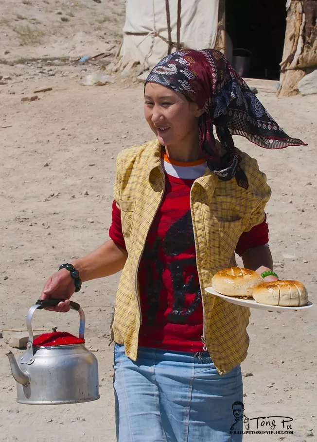 “你們來了啊?!避噭偼O拢h(yuǎn)遠(yuǎn)看見我們的柯爾克孜族姑娘塔瓦爾古麗,快步微笑著向我們迎了過來。前幾天這一路來回已經(jīng)兩次在她家住過后,我們已經(jīng)很熟悉了,大家都喜歡上這個(gè)和善可親,開朗漂亮的姑娘,親切地叫她古麗。離開古麗家才兩天,又見了面,我們仿佛就像是老朋友似的。