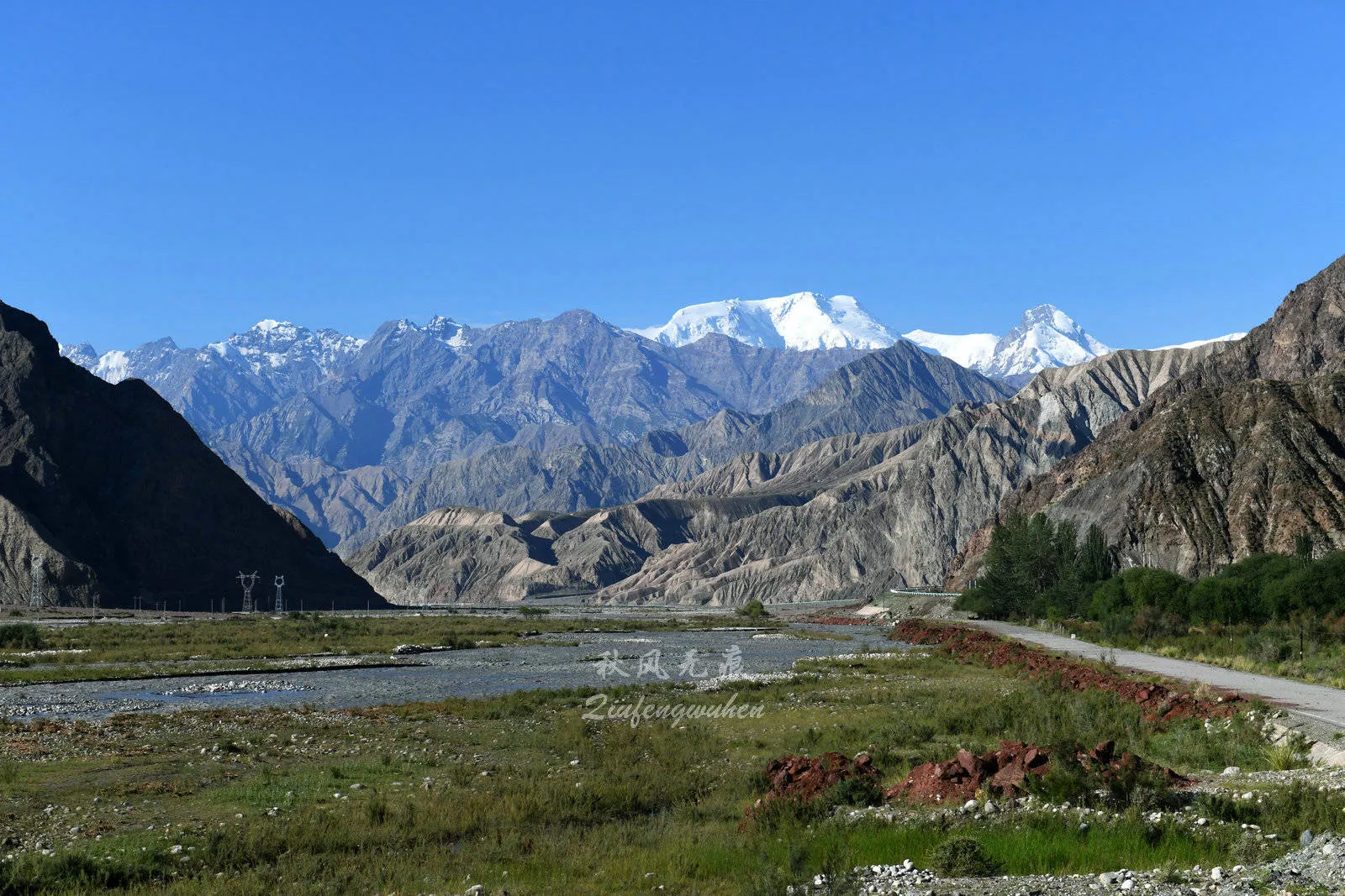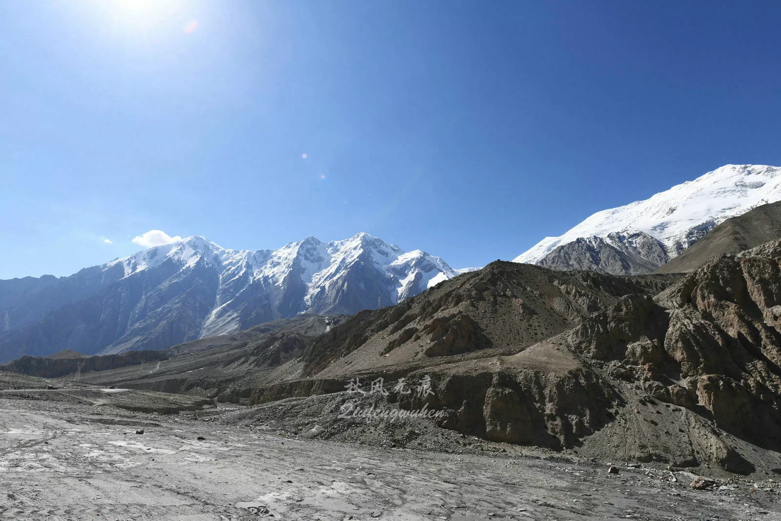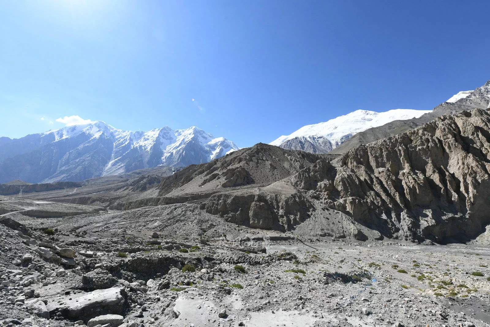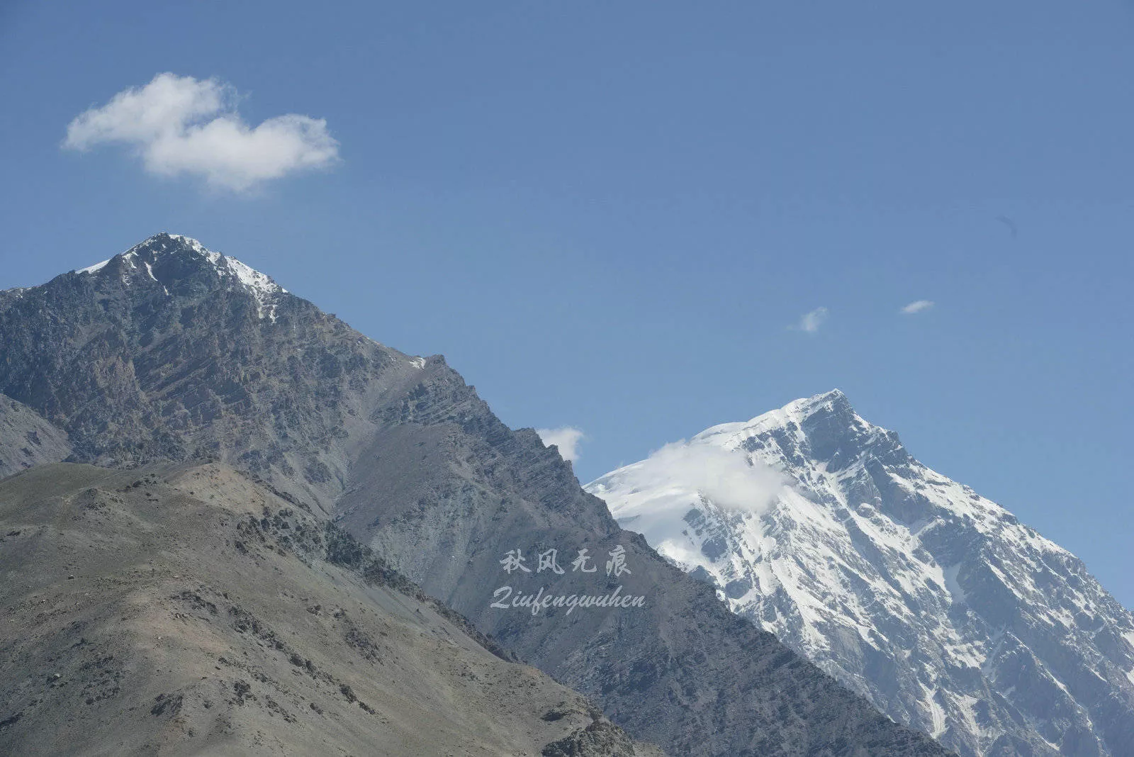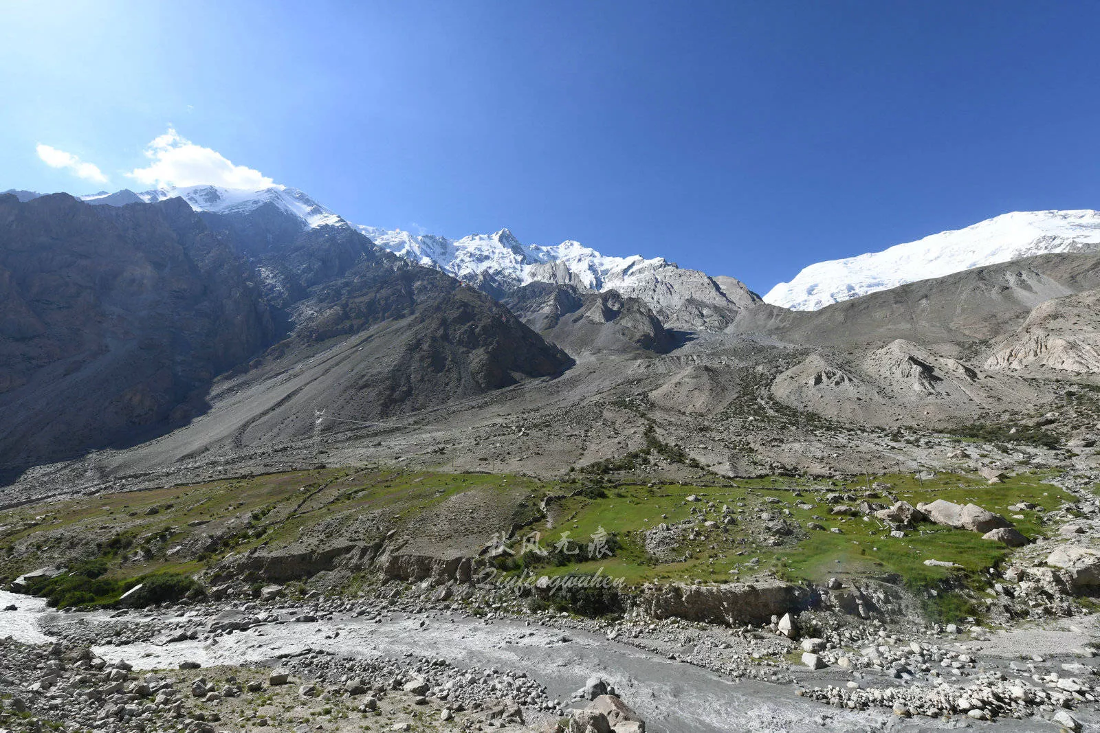 進(jìn)入海拔2500米的蓋孜河大峽谷的崇山峻嶺,雪山漸漸成為了風(fēng)景的最靚,一朵朵白云在雪山之巔環(huán)繞,雪山之下,砂礫狀的山體分布在山的中段,泥石流的痕跡讓人擔(dān)憂暴雨里的行程,而山根的綠色,彰顯著帕米爾高原生命的頑強(qiáng)。