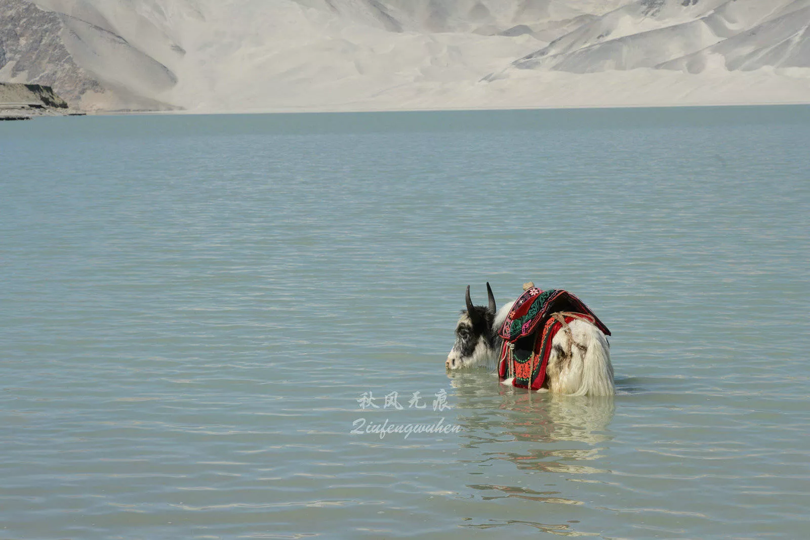 白沙湖邊身著民族服裝的柯爾克孜人牽著牦牛,讓游人留下身影,而美麗的湖水與白沙山巒,在陽光變化中,在水中投下身影,湖邊的雪山也為美麗丹色白沙湖鐫刻的風(fēng)景里的色彩。
