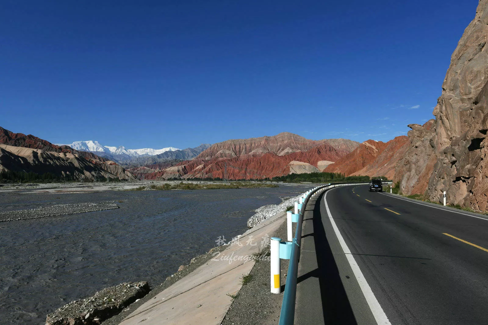 穿行紅山間,路邊的河流里,雪山之水帶著紅山的顏色潺潺流過,水邊的紅山更為真切,雪山之下是紅色的山巒,河流的側(cè)面灰色的山體成為主色,在豐富的山色里,穿行的道路也成為風(fēng)景,一幅幅美麗的畫面,讓駕駛的旅程目不暇接,也讓景中的旅程,驚喜不斷。