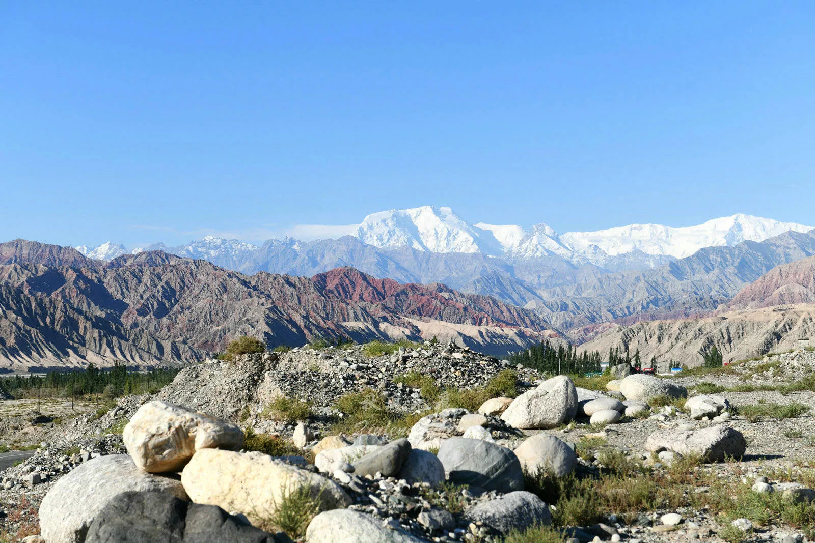 夏日的喀什,天氣很是悶熱,在白天超過40C°的高溫里,領(lǐng)略了古城風(fēng)景。清晨,在涼爽的晨風(fēng)里,開始去帕米爾高原的旅程。離開喀什市區(qū),G314路邊一排排白楊樹道路與村落隔開,筆挺的白楊樹成為新疆自駕路邊一道靚麗風(fēng)景,行進(jìn)中,白楊樹與道路的盡頭出現(xiàn)了紅山與雪山的身影,停車路邊休息車位,走上人車稀少的道路,一張白楊樹與道路的風(fēng)景照,開啟著對(duì)帕米爾高原的憧憬。
