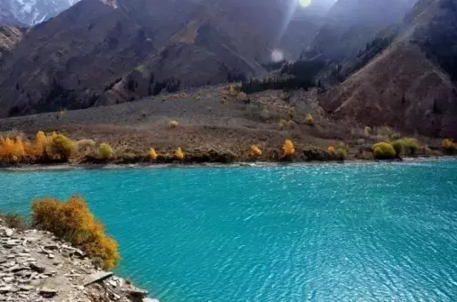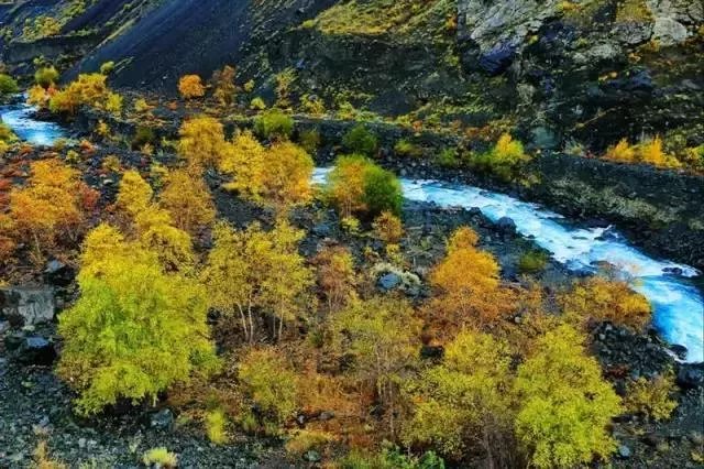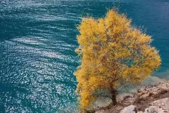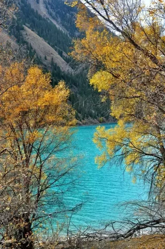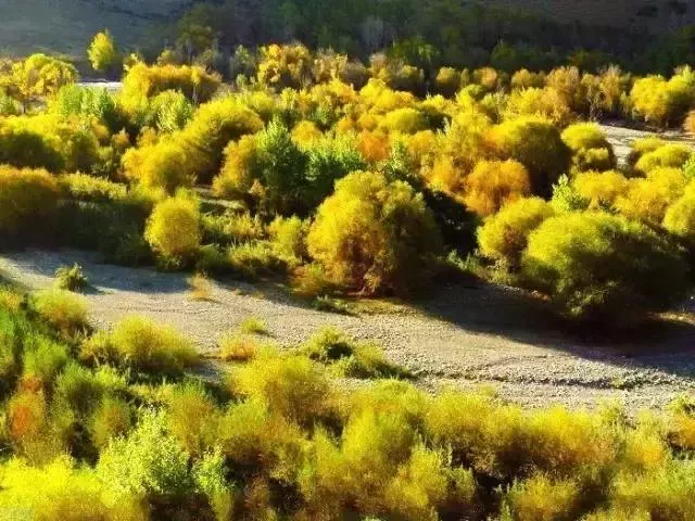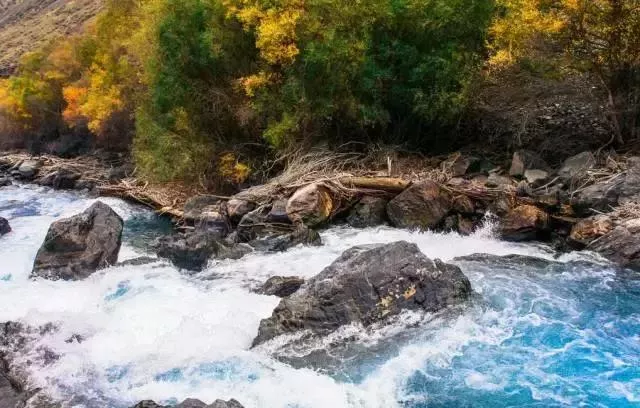 奎屯河為依連哈比爾尕山中段北側(cè)積雪融化而形成,水量較大且波濤洶涌,河床內(nèi)多巨石,河谷上生長(zhǎng)著大量的苦楊,秋季金黃一片,與湖水和河水相襯,景色異常壯美。