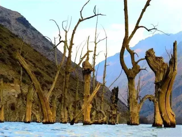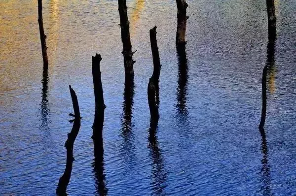 湖中屹立著被歲月沖刷洗禮仍舊不倒的胡楊樹(shù)樹(shù)樁