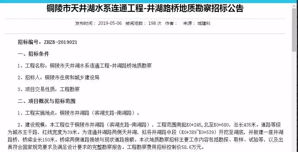 5月6日,銅陵市住房和城鄉(xiāng)建設(shè)局發(fā)布《銅陵市天井湖水系連通工程-井湖路橋地質(zhì)勘察招標(biāo)公告》,向社會(huì)招標(biāo)井湖路橋地質(zhì)勘察單位。