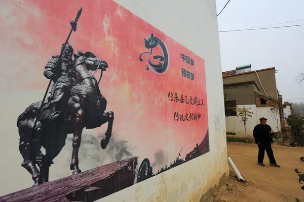 村里的屋舍墻上貼著岳飛忠心報國的海報。