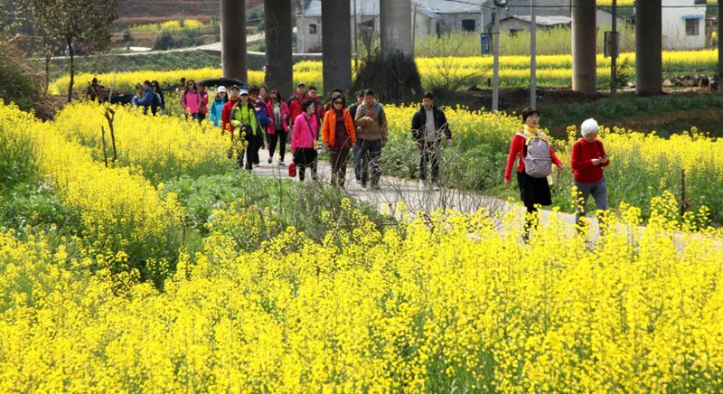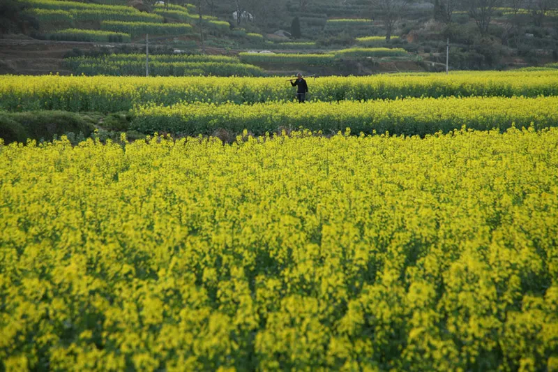 雄村油菜花連山片連片,綠水青山襯映著金色大地,農(nóng)民勞動(dòng)場(chǎng)景在花海中點(diǎn)綴,動(dòng)感畫面迎來攝影人不停按下快門,游人在畫中陶醉。(吳建平)