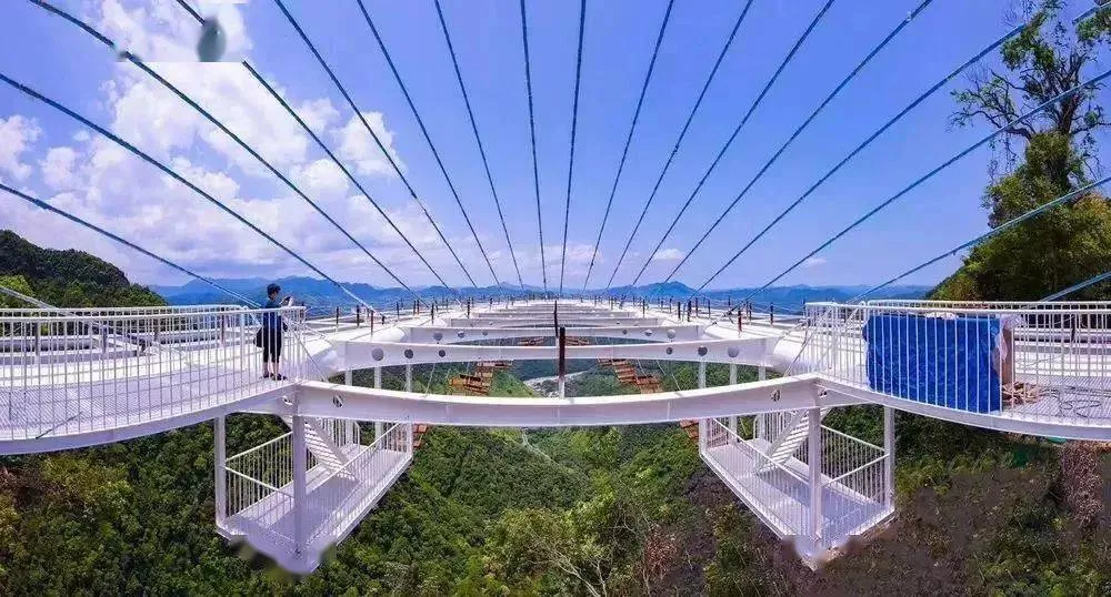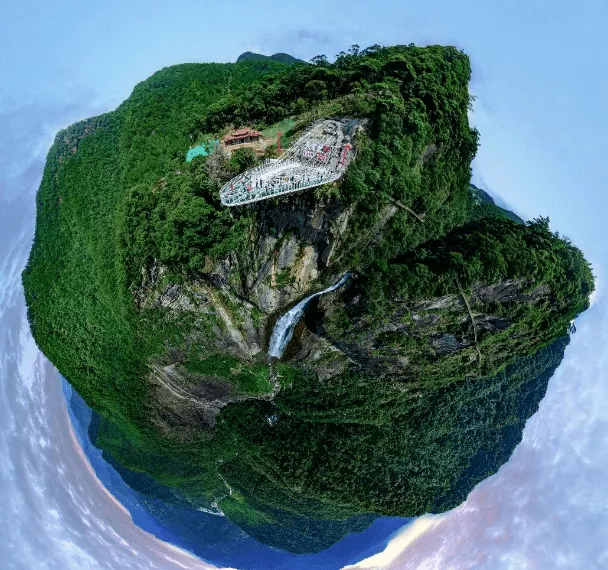 瀑布斜上方是新建設(shè)的玻璃觀景臺——天空之心,站在上面可俯瞰岱仙瀑布全景,有“人在空中走,景在腳下游”的美妙體驗。