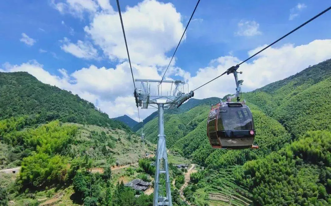 搭乘纜車到索道上站,石牛山索道全程7.2千米,為華東第一長索道,一路如行進(jìn)在一副恢弘畫卷中,沿途穿越石牛山的古樸村落、森林和竹海,可以俯瞰岱仙雙瀑布,景色壯觀,極為震撼,全程大約半個小時。