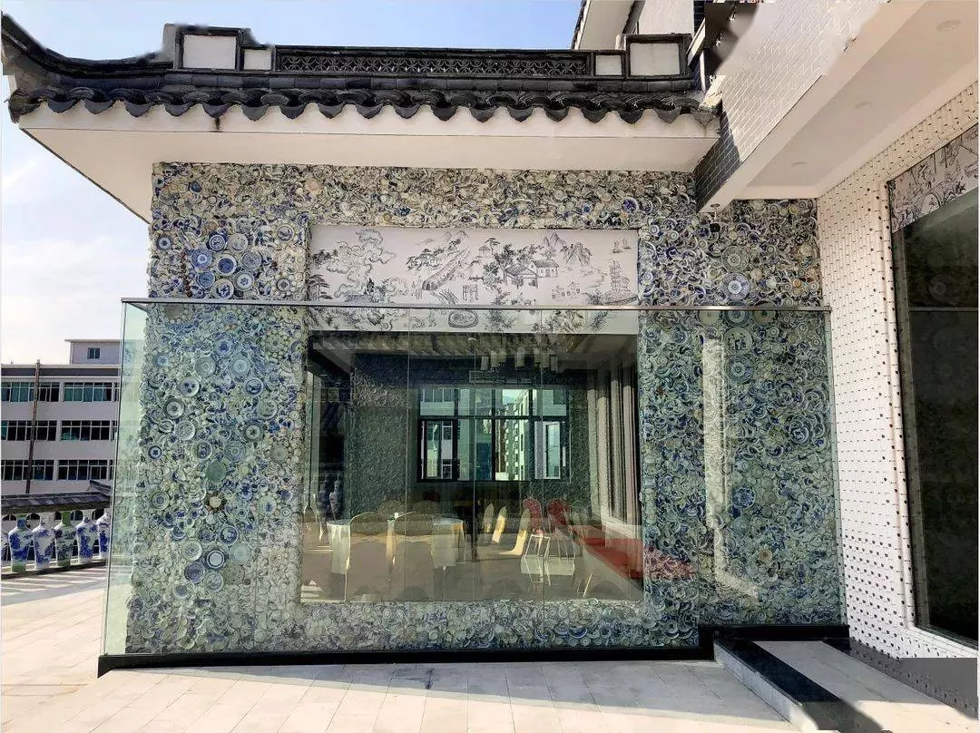 “ 千窯萬瓷”作為悅瓷樓左右兩旁的大型墻面,一共使用了 10萬多塊的古瓷片,以及部分保存完整的 清代青花瓷盤,如位于左右兩側(cè)的龍紋盤與鳳紋盤等,均由 大興堡鄭氏家族歷代傳承而來?!翱蛇h(yuǎn)觀而不可褻玩焉”,貼近墻面看不到明顯的輪廓,于遠(yuǎn)處便能在錯落的瓷片之中感受到青花瓷如花朵綻放。