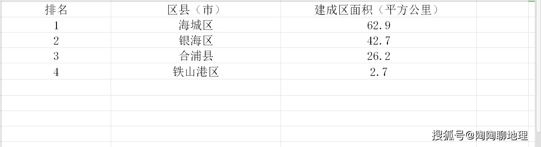 北海市3區(qū)1縣建成區(qū)面積排名表