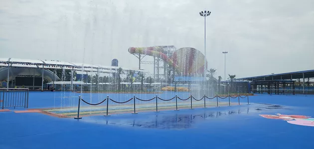 旱地噴泉位于水上樂園正門附近,當音樂想起時,水花從地下噴泉涌出在彩燈照射下,地面猶如五顏六色的鏡面,將空中飛舞的水花映襯的無比嬌艷歡快的水柱此起彼伏,給游客一個地道的"水上樂園式"歡迎。