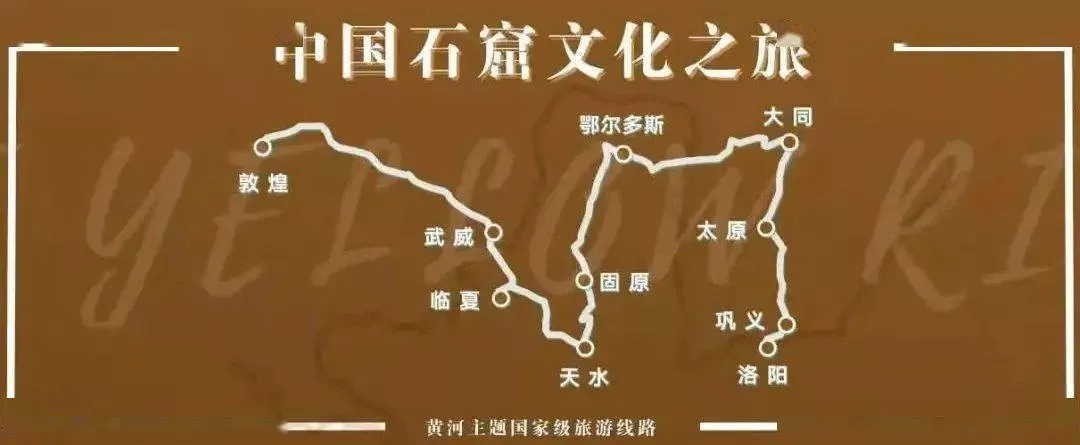 敦煌(莫高窟)—武威天梯山石窟)—臨夏(炳靈寺石窟)—天水麥積山石窟)—固原須彌山石窟)—鄂爾多斯阿爾寨石窟)—大同云岡石窟)—太原天龍山石窟)—鞏義(鞏縣石窟)—洛陽(yáng)(龍門(mén)石窟