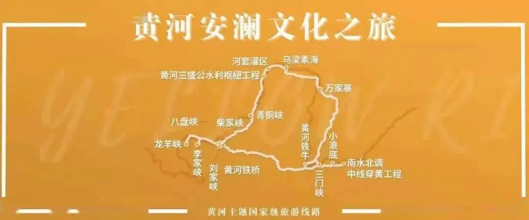 海南藏族自治州(龍羊峽)—蘭州市(柴家峽、八盤(pán)峽、黃河鐵橋)—臨夏回族自治州(劉家峽、鹽鍋峽)—定西市(李家峽)—吳忠市(青銅峽)—巴彥淖爾市(黃河三盛公水利樞紐工程、河套灌區(qū)、烏梁素海)—咸陽(yáng)市(鄭國(guó)渠)—運(yùn)城市(黃河鐵牛)—忻州市(萬(wàn)家寨)—三門(mén)峽市(三門(mén)峽)—洛陽(yáng)小浪底)—鄭州(南水北調(diào)中線穿黃工程)