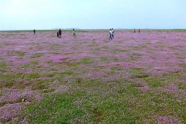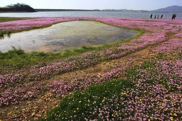 相傳朱元璋曾駐足此山,并脫下袍服晾曬,故此而得名??菟竟?jié)是一片湖洲,遼闊的洲頭,綠草如茵,就象鋪上了望不到頭的綠色地毯,寬闊的草灘上盛開了無數(shù)的小花,一望無際。
