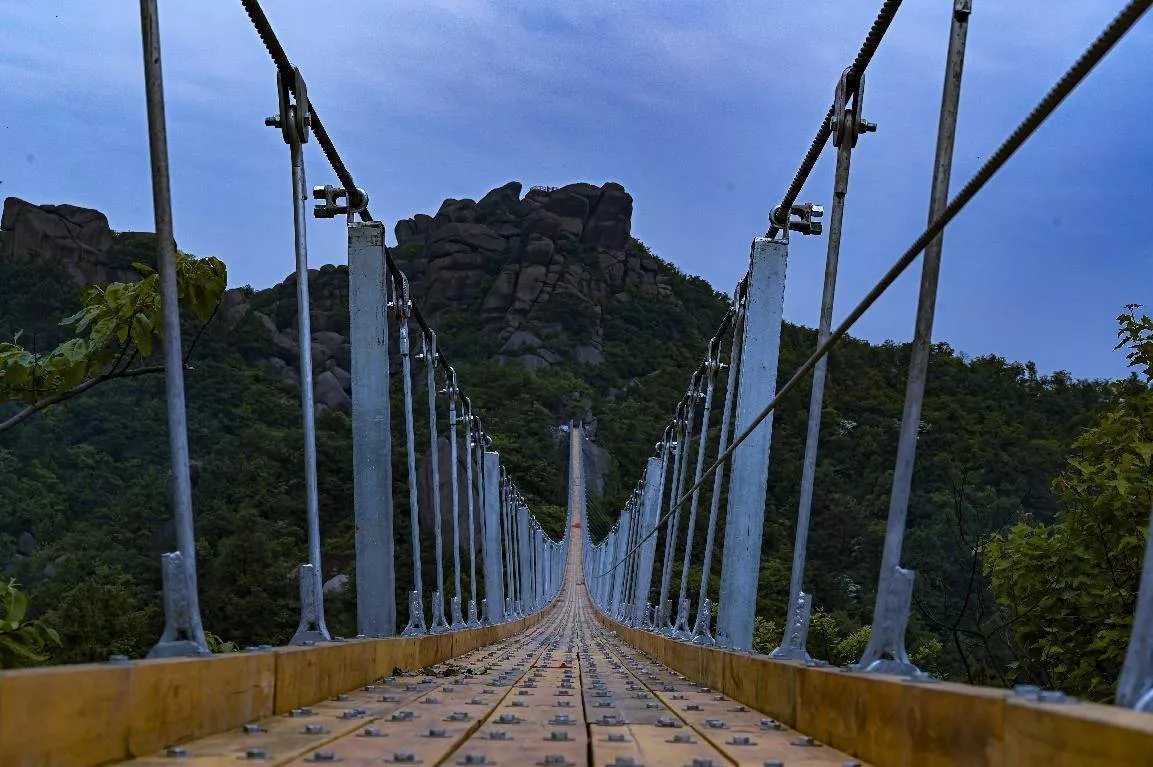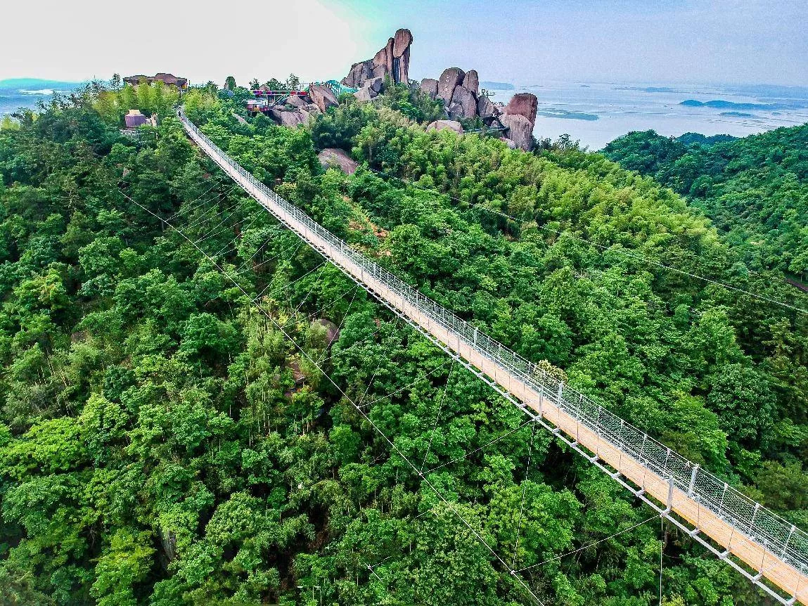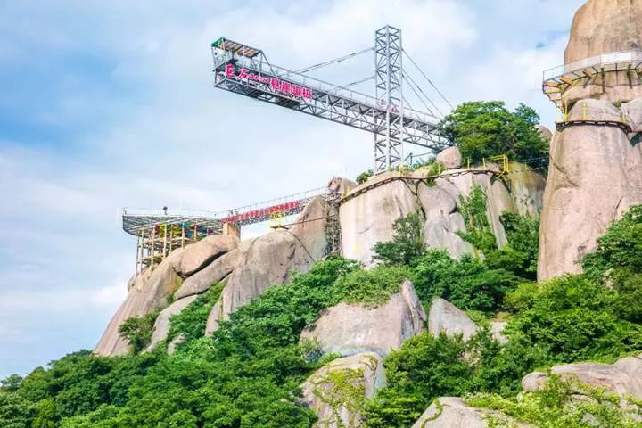 這座365米的黃金項鏈橫跨在天險之上,,安慶520巨石山“過江龍吊橋”其長度更長于聞名世界的德國吊橋,其驚險程度更是不亞于前者。