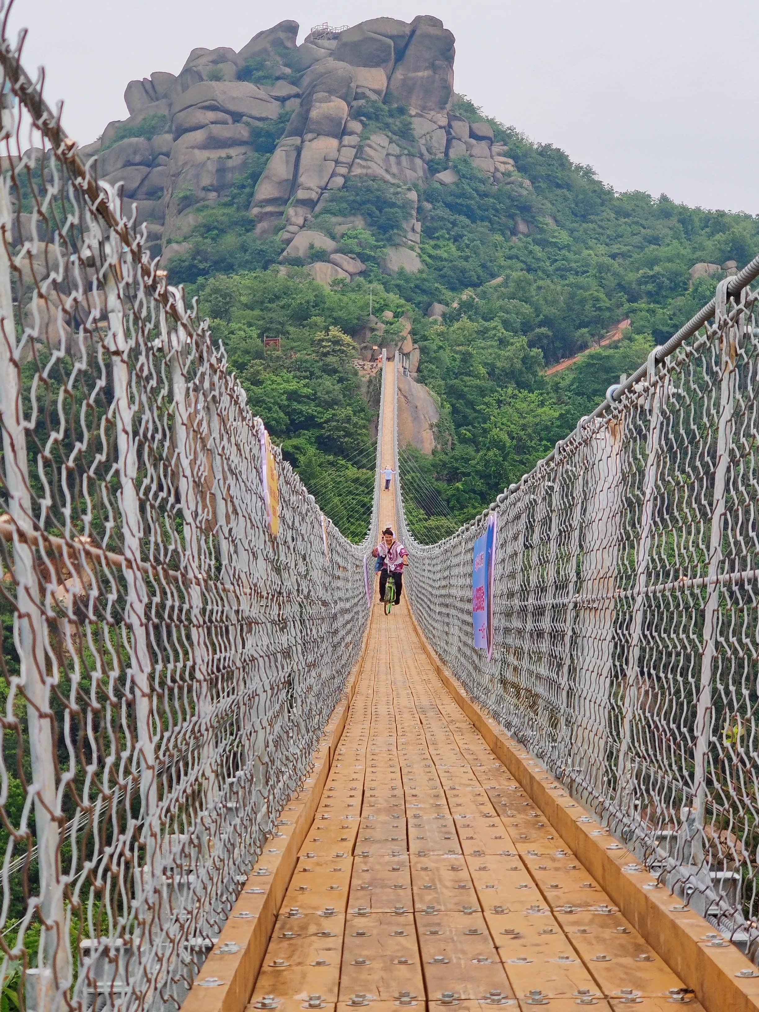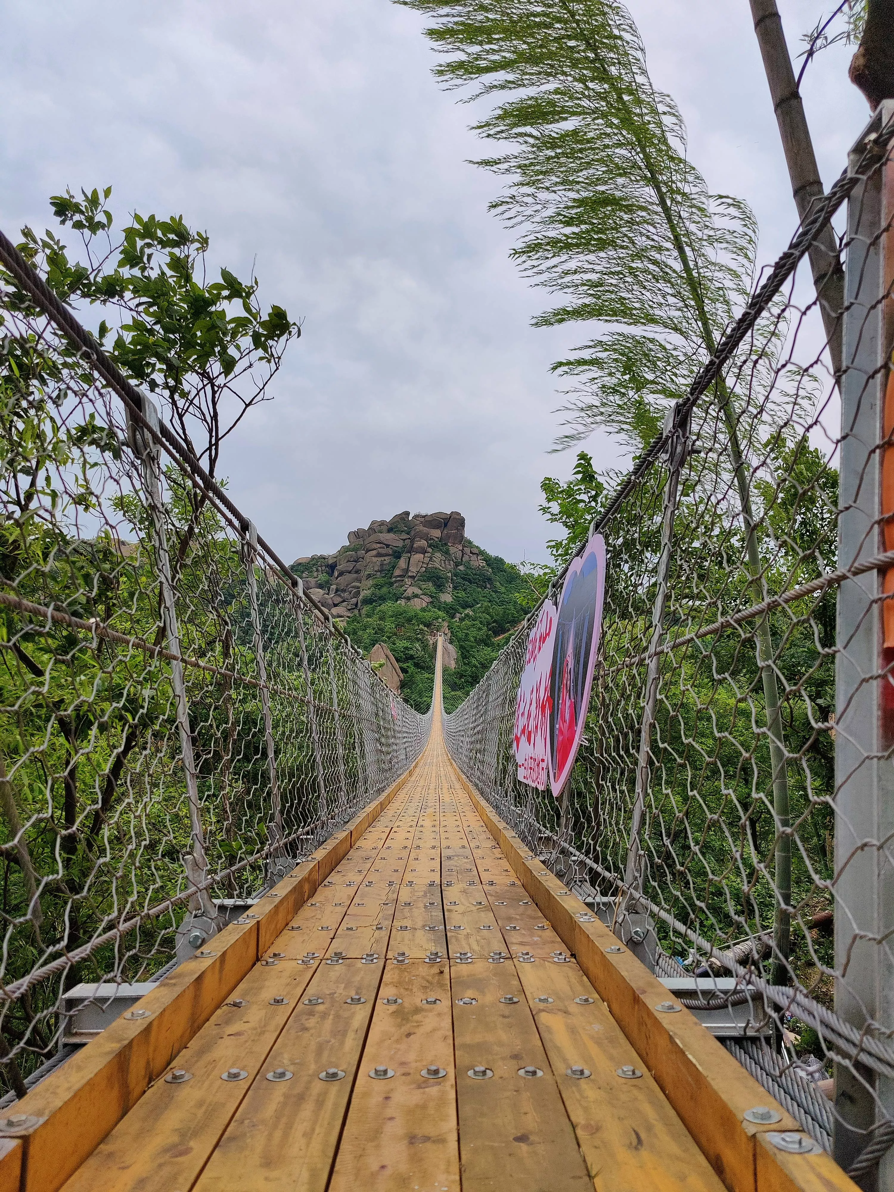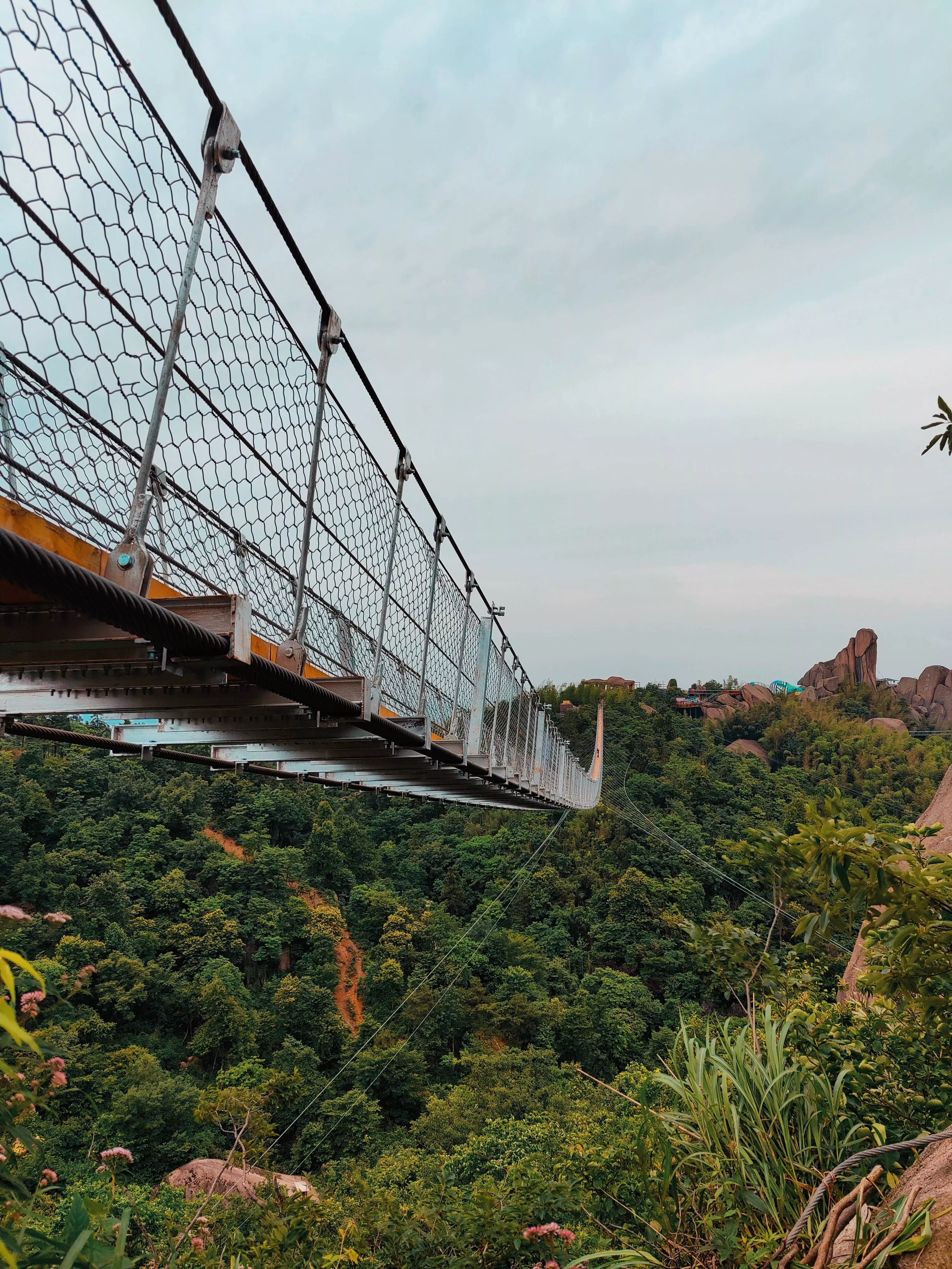 520巨石山過江龍吊橋全長365米,距離地面52米高度的吊橋建在半山之上,自山巔而下,