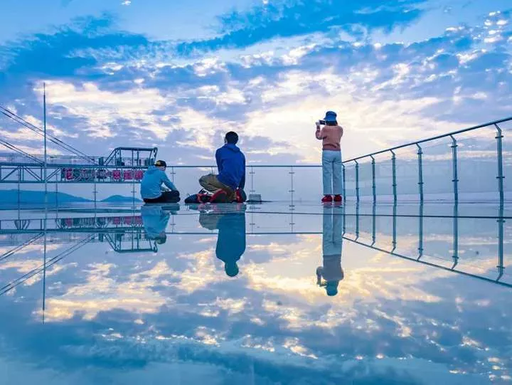 世界上最大的心形玻璃觀景臺,五顏六色的玻璃倒映的天空是蔚藍的,