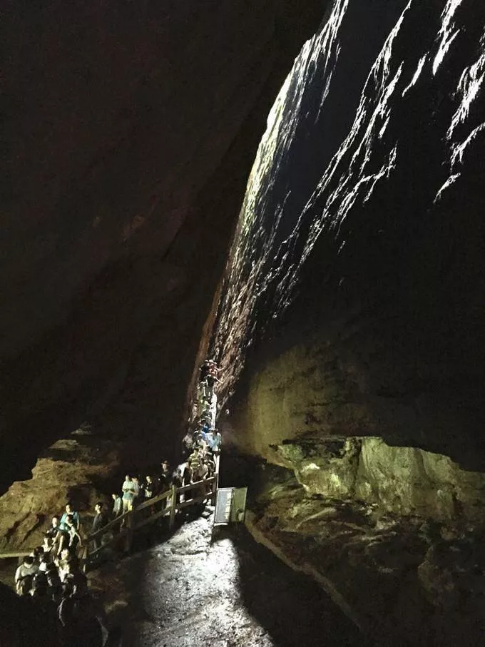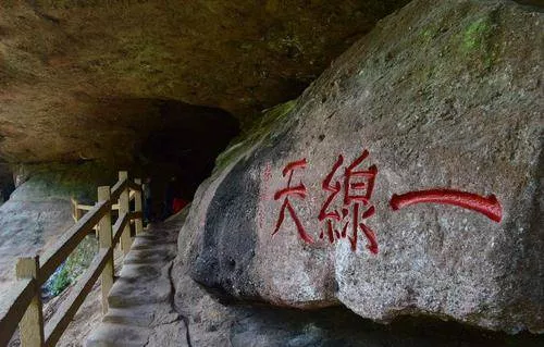 一線天山巖長(zhǎng)數(shù)百丈,高千仞,名靈巖。巖端傾斜而出,覆蓋著三個(gè)毗鄰的巖洞:左邊靈巖洞,中間是風(fēng)洞,右邊是伏羲洞。從伏羲洞進(jìn)入巖內(nèi),到巖內(nèi)的深處,巖頂有一裂縫,就象利斧劈開(kāi)一樣,相去不滿一尺,長(zhǎng)約一百多米,從中漏進(jìn)天光一線,宛若跨空碧虹。這就是令人嘆為“鬼斧神工之奇”的一線天。
