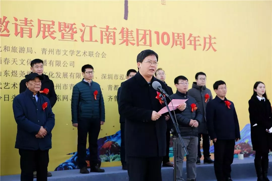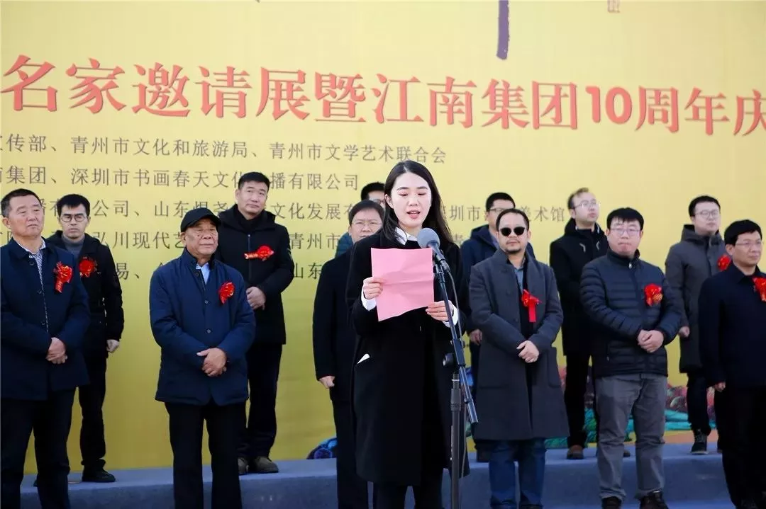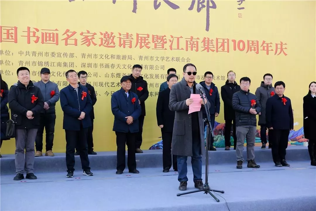 青州市文化和旅游局局長(zhǎng)楊愛(ài)東女士主持了本次開展儀式,并依次介紹了出席本次展覽的嘉賓,他們分別是:中國(guó)共產(chǎn)黨第十五至第十九次全國(guó)代表大會(huì)代表、全國(guó)勞動(dòng)模范、全國(guó)優(yōu)秀共產(chǎn)黨員、新中國(guó)成立以來(lái)感動(dòng)中國(guó)雙百人物王樂(lè)義先生;青州市委常委、宣傳部長(zhǎng)陳同洲先生;青州市政協(xié)副主席王壽禮先生;中國(guó)藝術(shù)研究院藝委會(huì)委員、中國(guó)美協(xié)理事桑火堯先生;北京大學(xué)研究員、博士生導(dǎo)師祝帥先生; 國(guó)家級(jí)一級(jí)美術(shù)師,中國(guó)美術(shù)家協(xié)會(huì)會(huì)員,中央美院藝術(shù)工程部藝術(shù)顧問(wèn)王玉先生;文化部東方文化藝術(shù)院副院長(zhǎng)兼國(guó)畫院院長(zhǎng)、中央國(guó)家機(jī)關(guān)美術(shù)家協(xié)會(huì)藝術(shù)顧問(wèn)劉兆平先生; 中國(guó)藝術(shù)研究院副研究員,碩士研究生導(dǎo)師陰澍雨先生; 湖北美術(shù)學(xué)院九三學(xué)社主委、九三學(xué)社中央書畫院副院長(zhǎng)張大風(fēng)先生;青州市融媒體中心主任、青州市廣播電視臺(tái)臺(tái)長(zhǎng)蔡子國(guó)先生;青州市人民政府云門山街道辦事處黨委書記郇金剛先生;青州市文聯(lián)主席、中國(guó)美術(shù)書法家(青州)創(chuàng)作服務(wù)中心主任趙世華先生;中國(guó)藝術(shù)研究院博士、山東藝術(shù)學(xué)院教授王謙先生;保定市美術(shù)家協(xié)會(huì)主席劉發(fā)起先生;清華大學(xué)藝術(shù)學(xué)理論博士后、中國(guó)藝術(shù)研究院博士薛帥杰先生;中國(guó)藝術(shù)研究院博士、中國(guó)藝術(shù)研究院中國(guó)書法院研究員傅振羽先生;中國(guó)藝術(shù)研究院博士聶國(guó)強(qiáng)先生;中國(guó)藝術(shù)研究院博士、中國(guó)藝術(shù)研究院國(guó)畫院畫家劉少寧先生;中國(guó)藝術(shù)研究院博士、清華大學(xué)美術(shù)學(xué)院博士后趙鵬輝先生; 中國(guó)藝術(shù)研究院美術(shù)碩士、在讀博士荊晶女士;中國(guó)藝術(shù)研究院博士李樂(lè)然先生;中國(guó)藝術(shù)研究院博士胡裔濤先生; 深圳市書畫春天文化傳播有限公司總經(jīng)理劉金亮先生;青州市錦繡江南集團(tuán)董事長(zhǎng)鐵繼華先生;青州市錦繡江南集團(tuán)辦公室主任邱麗麗女士。