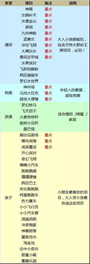 從表格中可以看到,綿陽方特東方神畫有13個通用項目、3個刺激項目、5個浪漫項目、22個親子項目。在4大分類中,通用類集合了東方神畫最多的王牌項目(標(biāo)注為重點),適合大人、小孩、老人等不同年齡段。這些重點項目是方特的主打,也是方特和其他主題樂園最大的不同。如果時間足夠的話,一定要把通用類的重點項目都一遍。