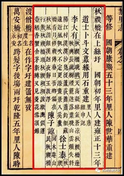 清嘉慶《黎里志》:秋禊橋在上絲圩,國(guó)朝初年,里人建。雍正十三年(1735),道士卜斗文募緣用石重建。