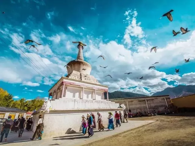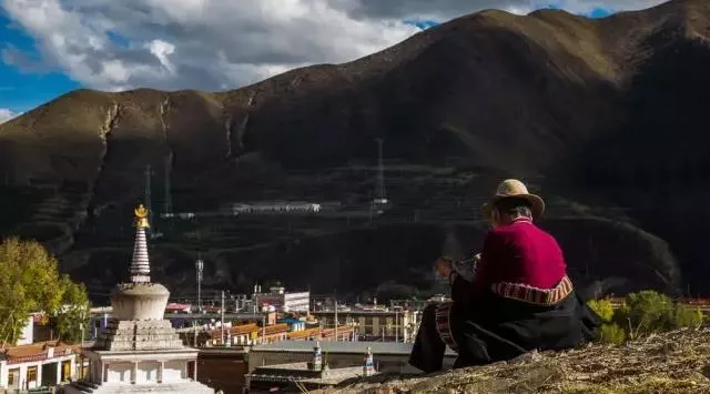 站在廣場上舉目四望,會發(fā)現(xiàn)這里的人大都習慣繞著白塔順時行走。因為順時是藏傳佛教認可的方向,而逆行則為苯教。