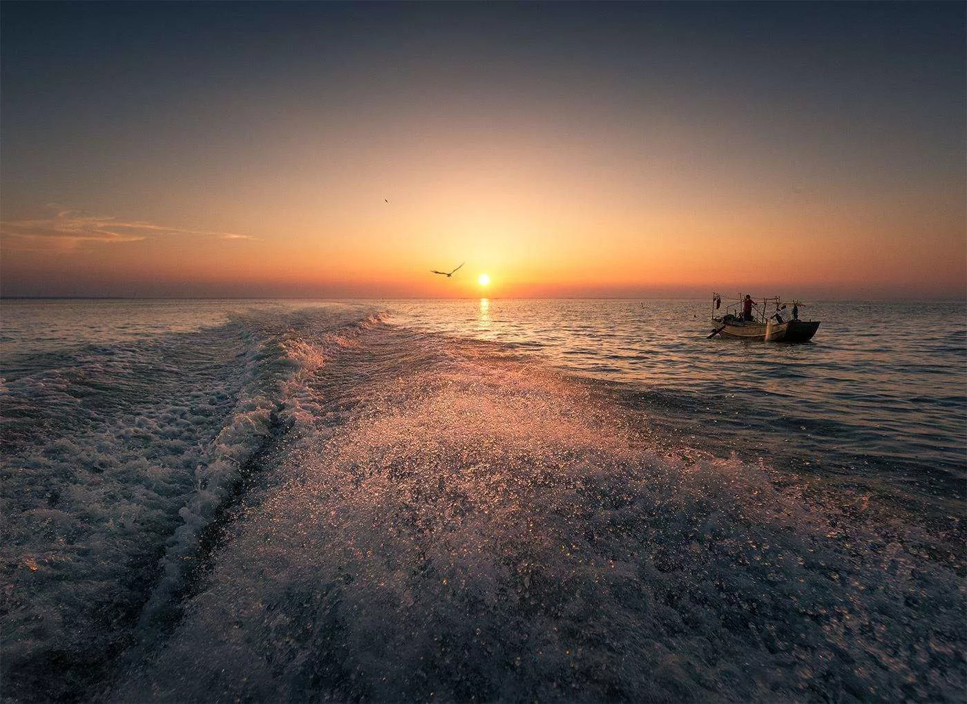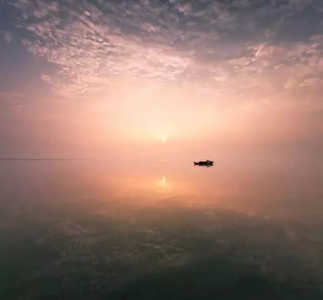 在晚霞漫天的時(shí)候,離開那開闊無(wú)邊的高郵湖上,一輪紅色的夕陽(yáng)倒映其上,湖面波光粼粼非常壯闊。