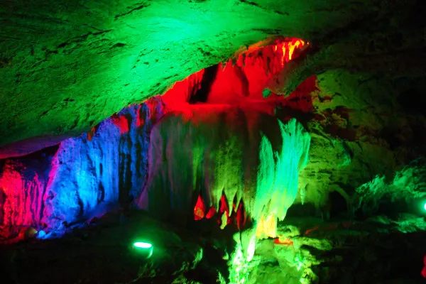 如果你行程緊張,來不及看黃果樹瀑布或織金洞,那么可以到這里聊以慰藉。天河潭景區(qū)的溶洞包括水洞和旱洞兩部分,合成雙龍洞。其中水洞必須乘船游覽,旱洞巖沿著步道行走就好,中速走完大概40分鐘。先坐電瓶車來到水洞入口,景區(qū)船夫撐著鐵皮車船帶大家游覽水洞并做簡單講解,游玩整個水洞大概20分鐘。水洞所在的地方其實是個小型天坑,天河潭景區(qū)就是因下雨在天坑底部積累成的泓幽綠潭水而得名。旱洞的入口在水洞下船點的旁邊,可一路觀看彩燈照耀下的鐘乳石和石筍。從旱洞出來會看到一座頗為壯觀的瀑布,憑欄下望,有不少人在瀑布前拍照,這里也是貴陽人熱衷的婚紗攝影地。一路前行,途中跟隨路標(biāo)向右下方走,可以到瀑布跟前。