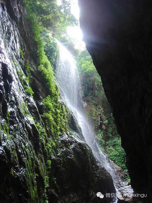 一線(xiàn)天,在長(zhǎng)潭入口處右側(cè),左右兩邊雙峰對(duì)峙,峭壁削立,似兩把尖刀插入云天,高數(shù)百米,一股清泉從兩峽中傾瀉下來(lái),仿若銀帶掛珠簾;山腰有一叢美人蕉,似美女婷婷玉立,翩翩起舞迎接游人。抬頭仰望,峰際間露出一線(xiàn)藍(lán)天,一線(xiàn)天水從天而降灑成瀑布,飄灑在谷底的千奇百怪的石頭上。