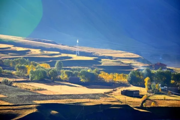 歷經(jīng)時(shí)間的積淀,渲染到極致。大片燦爛得近乎鋪張的金黃,襯著醉人的紅,在山坡上曠野里涂抹著,綿延著,漫得到處都是。柔軟的心,被這樣厚重的色彩撩得激動(dòng)不已。恨不能將醉人的秋色捧一捧掖在心里。 如果季節(jié)是設(shè)計(jì)師,那畫(huà)師一定是陽(yáng)光。先用畫(huà)筆在天空勾出大片白云悠悠的藍(lán),再拿一把金黃的油漆刷,從平地到山坳,不用過(guò)渡與鋪墊,將高原染成深深淺淺的紅與黃。路邊不時(shí)看到三五成群的牛羊?;蛴崎e地低頭吃草,或在陽(yáng)光下迎著風(fēng)出神地凝望遠(yuǎn)方。散落在山坡上的牛羊,來(lái)來(lái)回回,使空曠的原野變得生動(dòng)。