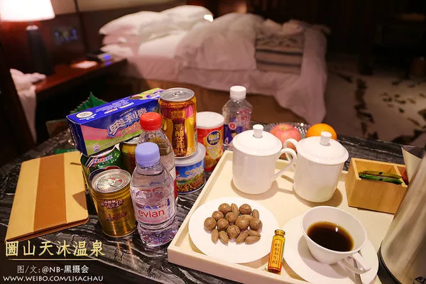 泡完溫泉回房間,發(fā)現(xiàn)客房服務(wù)在床頭放了礦泉水蜂蜜養(yǎng)生醋。