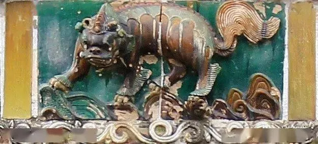 “義冠古今”楣額四周飾纏枝牡丹,框之上方正中部置一觀音像,兩側(cè)以12個(gè)“福”字作陪襯。其下雕一解豸(圖九),高凸與壁面作俯視眾生狀,解豸為神話傳說中的山水神魯,能明是非,辨善惡,是秉公執(zhí)法的代表。主圖案之間及兩側(cè)滿布分嵌,寓福壽雙全的福、壽字樣和寓意吉祥富貴、和合生財(cái)?shù)哪档D案,再上為二龍戲珠與纏枝牡丹。檐下斗拱作變形處理,如翼飛展,富裝飾性。照壁頂部琉璃正脊表面為高浮雕行龍與纏枝牡丹,端部各立一獅為吻,正中脊剎為獅馱寶瓶,兩側(cè)分立樓閣及狎魚、海馬等神獸。檐部釘帽系以白灰塑就之壽桃形。