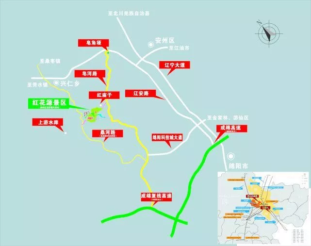 成綿復(fù)線綿陽高新區(qū)出口~高新區(qū)河邊鎮(zhèn)海峰村~花荄鎮(zhèn)斬龍村~紅花村紅花源景區(qū)
