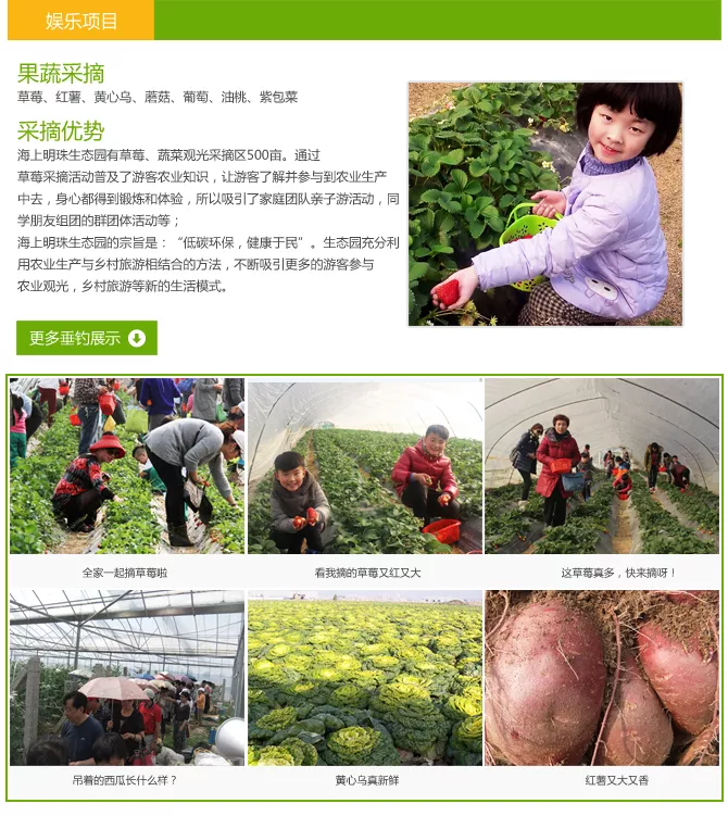 海上明珠生態(tài)園主要分為四個(gè)區(qū)域:草莓、蔬菜觀光采摘區(qū)500畝。通過草莓采摘活動(dòng)普及了游客農(nóng)業(yè)知識(shí),讓游客了解并參與到農(nóng)業(yè)生產(chǎn)中去,身心都得到鍛煉和體驗(yàn),所以吸引了家庭團(tuán)隊(duì)親子游活動(dòng),同學(xué)朋友組團(tuán)的群團(tuán)體活動(dòng)等;休閑垂釣娛樂區(qū)200畝。垂釣是一項(xiàng)古老的體育活動(dòng),老少皆宜,通過垂釣豐富了廣大市民及游客的業(yè)余生活;良種繁殖、農(nóng)事體驗(yàn)區(qū)1500畝;農(nóng)家樂餐飲區(qū)。農(nóng)家餐飲區(qū)為游客提供方便,游客在園區(qū)采摘的蔬菜現(xiàn)場(chǎng)加工,提高游客的食欲和興趣。海上明珠生態(tài)園的宗旨是:“低碳環(huán)保,健康于民”。生態(tài)園充分利用農(nóng)業(yè)生產(chǎn)與鄉(xiāng)村旅游相結(jié)合的方法,不斷吸引更多的游客參與農(nóng)業(yè)觀光,鄉(xiāng)村旅游等新的生活模式。