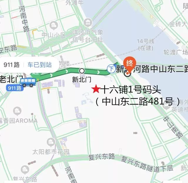 可在公交車站老北門站換乘911路至新開河路中山東二路站,步行200多米至十六鋪1號(hào)碼頭登船點(diǎn)