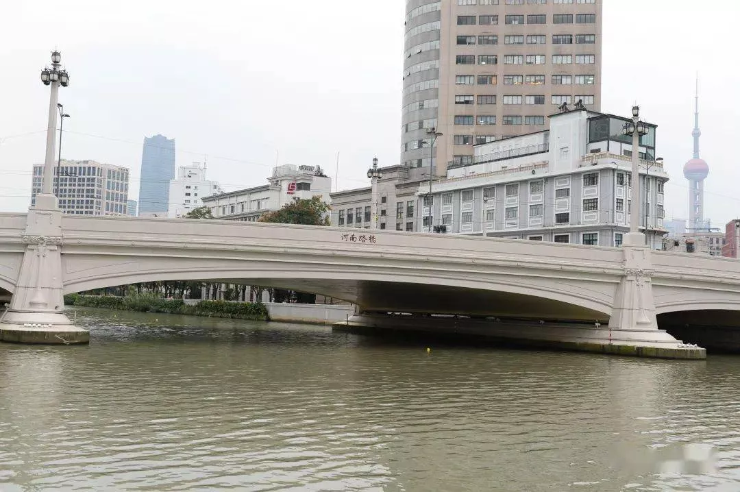 河南路橋距離我家所在的天潼路要相隔好幾條馬路,它位于天潼路街市的最東部。這座橋的歷史悠久,橋址原為清道光二十三年(1843)設(shè)的渡口,名為三擺渡。1875年由工部局建造了一座簡支梁木橋,名為三擺渡橋。光緒十年(1884)橋的西北堍建造起一座天后宮,三擺渡橋便被稱之為天后宮橋,上海人習(xí)慣稱天后為天妃,故這座橋又稱為天妃宮橋。