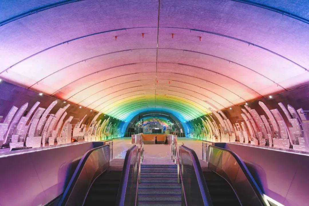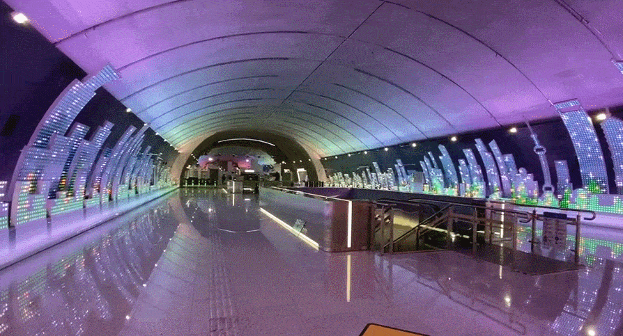 吳中路站開(kāi)創(chuàng)性地采用了預(yù)制大跨疊合拱型結(jié)構(gòu),以“無(wú)遮擋大空間”作為主導(dǎo)理念,著重強(qiáng)調(diào)空間的完整性,凸顯大空間的視覺(jué)觀感。站廳圍繞“大跨拱頂”這一顯著特征,在管線布局、結(jié)構(gòu)工藝、視覺(jué)表現(xiàn)等方面予以一體化設(shè)計(jì),公共區(qū)最大凈跨為21.6米,為國(guó)內(nèi)軟土地區(qū)最大跨度的全無(wú)柱車站。站廳兩側(cè)裝飾以LED燈帶,視覺(jué)效果引人入勝,有望成為市民乘客打卡的網(wǎng)紅車站。
