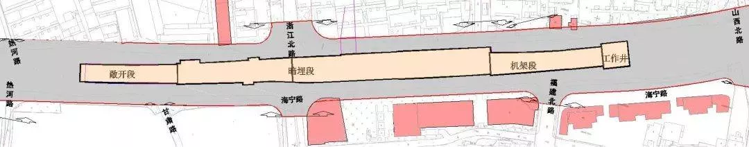 北橫通道新建工程Ⅴ標(biāo)段起于熱河路以東,線位走向沿海寧路。全長(zhǎng)約0.536公里,主要工作內(nèi)容包括盾構(gòu)工作井(含敞開(kāi)段、暗埋段)、道路、排水等土建工程。