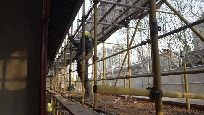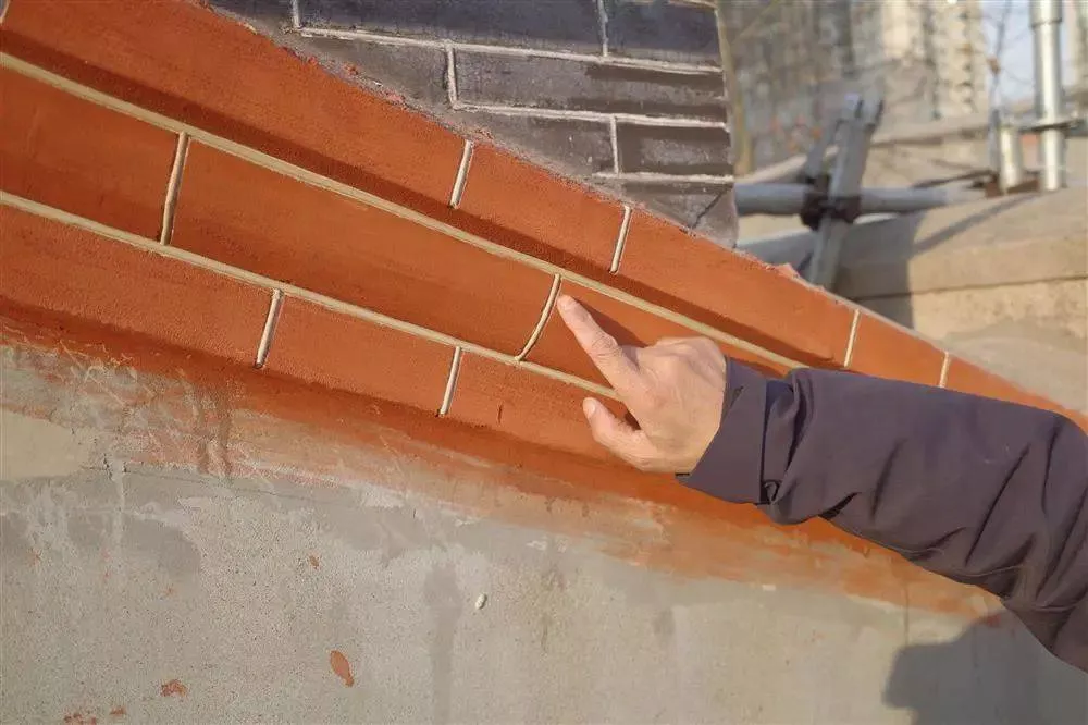 作為典型的石庫(kù)門建筑,清水墻面是中共一大會(huì)址紀(jì)念館的特色之一。在屋頂已經(jīng)修復(fù)好的清水墻面上,磚與磚之間的縫隙并不平整,而是采用了半圓形的“拱形”設(shè)計(jì),用手撫摸略微有些凸起。這在建筑上被稱為“元寶縫”,同樣是符合當(dāng)年原貌的設(shè)計(jì)。此外,施工方還利用特別調(diào)制的色漿和試劑把清水墻面部分做舊,力求呈現(xiàn)出歷史的滄桑感。目前,整個(gè)建筑的清水墻外立面修繕已完成50%。