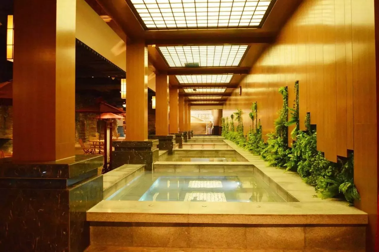溫泉區(qū)共有湯池12個、特色石板浴1個、水療按摩池1個、魚療池2個,女士及長發(fā)者下水前需佩戴泳帽哦。