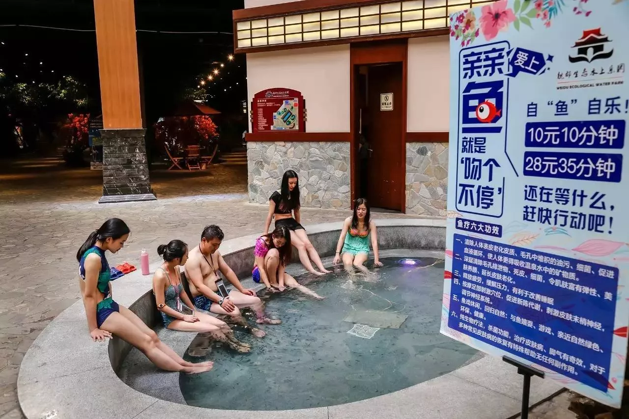 從水上樂園區(qū)出來就可以看到親親魚療池,池里歡快的小魚非??蓯?,讓人忍不住下池體驗,親親魚療池是有償項目,10元/10分鐘,28元/35分鐘。