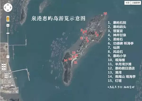 而從衛(wèi)星地圖上看惠嶼島,它的形狀更像是一只橫臥在海上的龍蝦,它由南北兩座相連的小島組成,北面臨海處的山勢成W狀,兩側(cè)突出海面的半弧形山脊,儼然是龍蝦的兩條前足,中間凹陷處的山丘酷似蝦頭,蝦頭上裸露出兩塊天然巨石,恰好點(diǎn)成了蝦目;蝦身延伸至最南端的南尾,就更像是蝦尾了。
