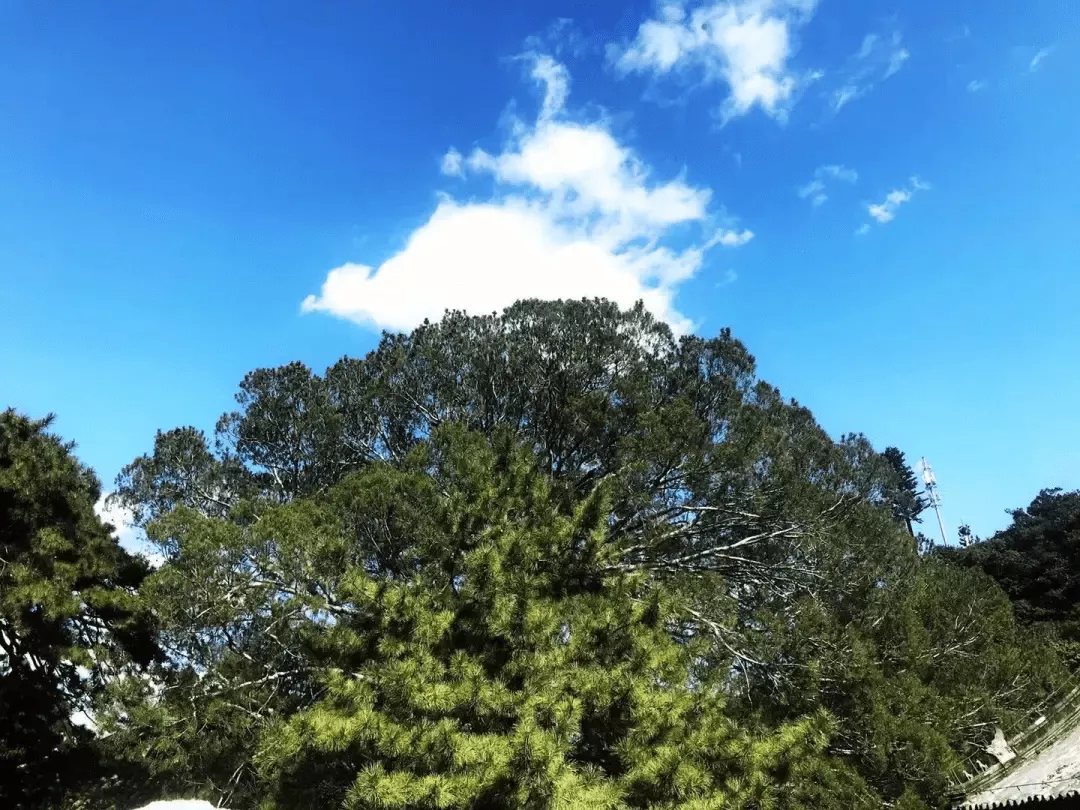 花園內(nèi),又一株松,樹齡亦是600年。其干粗狀筆直,沒有多余的雜枝,高潔無染,挺拔而上,與藍(lán)天竊竊私語;其冠渾圓,鬼斧而雕,神工以琢,層次分明,若打坐誦經(jīng)的青蓮,似合十參法的芙蓉,周圍繚繞若隱若現(xiàn)的青煙白云。